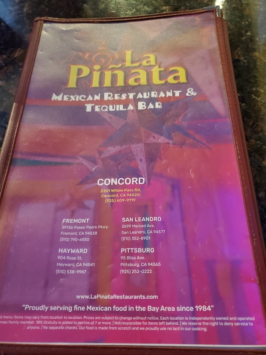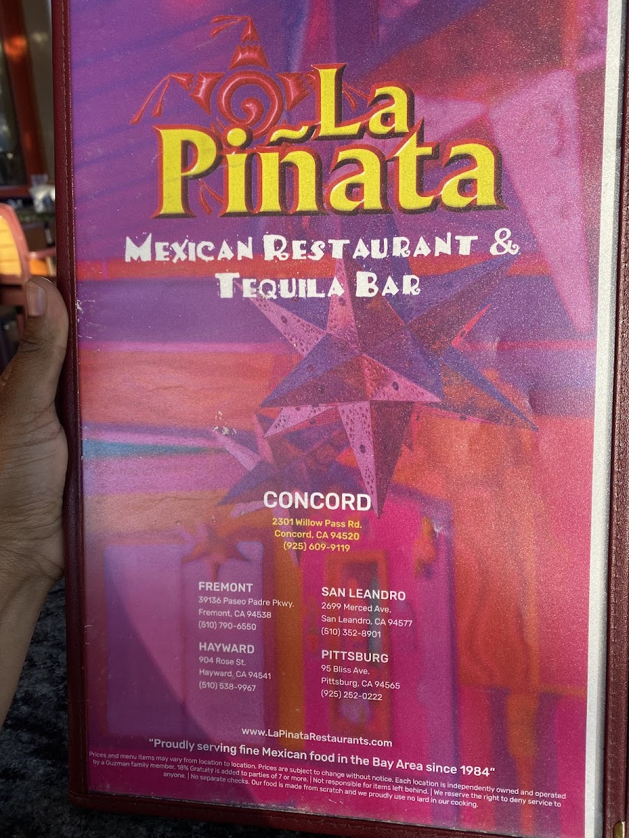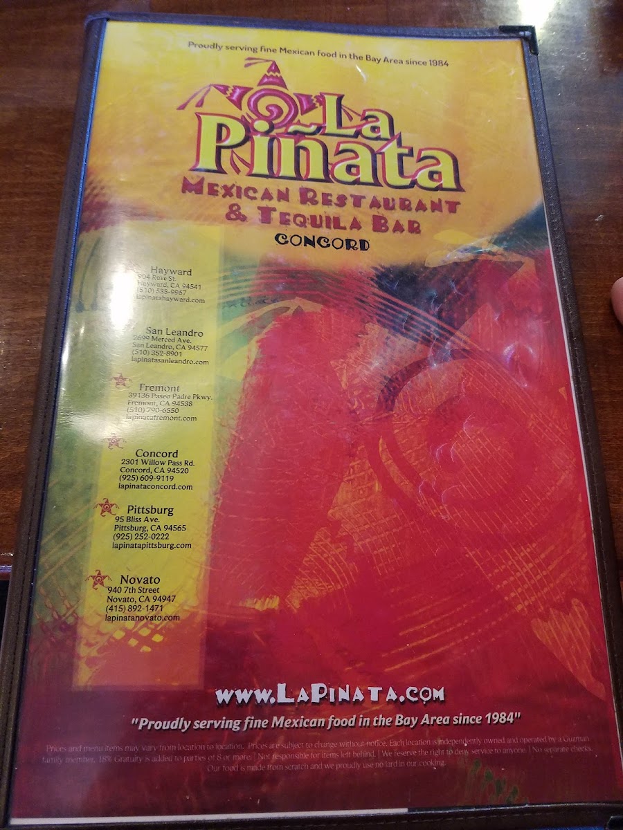 At La Piñata 6 Menu, located at 2301 Willow Pass Rd, Concord, CA, you’re in for a treat that brings a vibrant taste of Mexican flavors right to your table. The menu offers a wide variety of dishes that will satisfy any craving, whether you’re in the mood for a classic burrito, crispy tacos, or something with a little more spice. You’ll find everything from savory carne asada to tender grilled chicken, all paired with fresh salsas, homemade guacamole, and warm tortillas. Each dish is crafted with care, delivering a perfect balance of bold flavors and authentic ingredients. Whether you're stopping by for a quick bite or settling in for a meal with friends, the options are endless and every bite is filled with the delicious, comforting flavors you crave.